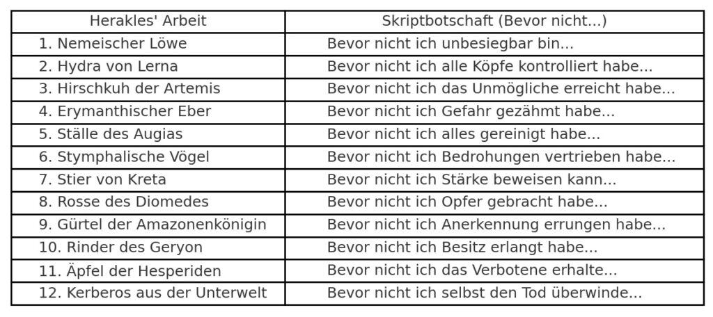 Eric Berne griff dieses Muster auf, um das Prozessskript „Bis / Bevor nicht“ zu verdeutlichen. Herakles lebt nie im Augenblick, sondern immer auf ein Ziel hin, das in der Zukunft liegt. Erst wenn er alle Aufgaben erfüllt hat, darf er anerkannt sein.